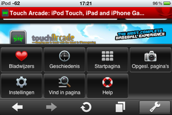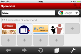Opera Mini presenteert een fraaie startpagina, met liefst 9 snelkoppelingen naar websites. Hier plaats je jouw favoriete pagina's, die supersnel laden bij het aantikken. Openstaande tabbladen bereik je gemakkelijk vanuit een overzichtje onderin je scherm. Hier huizen tevens de instellingen -onder een knopje met een Engelse sleutel- waar je onder andere de beeldkwaliteit en lettergrootte instelt. Opera Mini synchroniseert desgewenst je bladwijzers met de desktopversie van Opera, middels Opera Link.